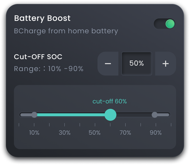 Our advanced technology allows direct tapping into DC power from the battery and solar panel, enabling virtual grid capacity expansion and 100% green power charging. Get ready for the future with V2H (Vehicle-to-Home) and V2G (Vehicle-to-Grid) capabilities, unlocking limitless possibilities for modern living. *V2X functionality is limited by the EV’s capabilities. Once the relevant standards are